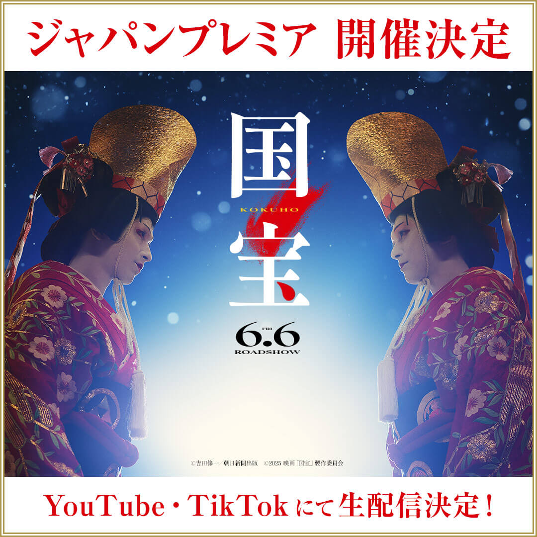 さらに、舞台挨拶の模様は、YouTube(東宝MOVIEチャンネル)・TikTok(『国宝』公式TikTok)にて生配信します。当日の生配信の詳細は、『国宝』公式X・公式Instagramにて事前に告知しますので、ぜひ『国宝』公式SNSアカウントをチェックしてお待ちください!
